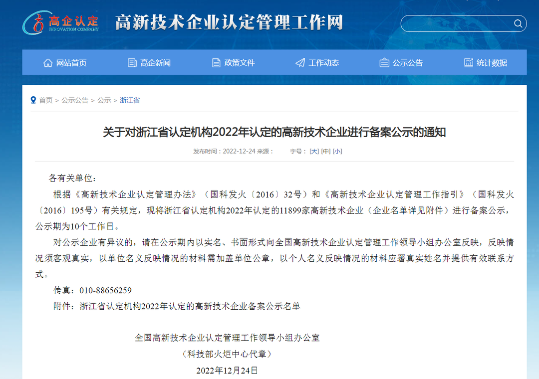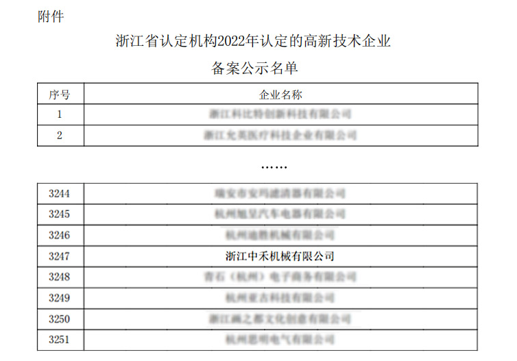 2022年12月24日,全国高新技术企业认定管理工作领导小组办公室发布了《关于对浙江省认定机构2022年认定的高新技术企业进行备案公示的通知》,浙江k8凯发机械有限公司荣获“国家高新技术企业”称号。