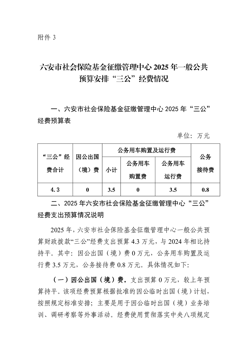 六安市社会保险基金征缴管理中心2025年一般公共预算安排“三公”经费情况